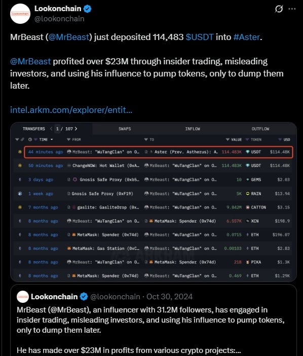 Druga znana postać, która kręcić się wokół Aster i również budzi kontrowersje to najpopularniejszy na świecie youtuber MrBeats. Influencer ma ponad 400 mln subskrybentów, co zapewne również przyczyniło się do wzrostu zainteresowania tokenem. Wszystko dlatego, że Lookonchain ujawnił, że MrBeats przelał do Aster ponad 114 tys. dolarów. To przykuło uwagę wielu inwestorów.