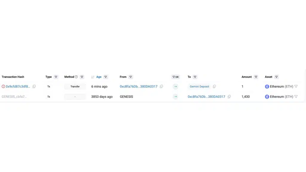 Platforma analityczna blockchain Lookonchain wytropiła adres po próbie wysłania małej transakcji testowej o wartości 1 ETH do Gemini. Przelew nie powiódł się z powodu niskich opłat za gaz, ale wystarczyło to, aby potwierdzić aktywność portfela po około 10,6 latach milczenia.