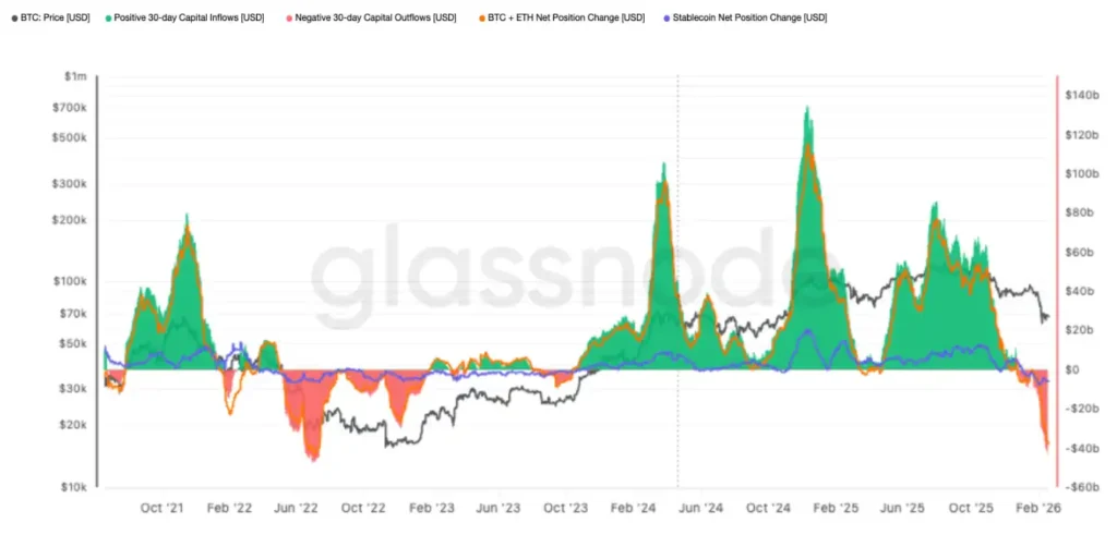 Najnowsze dane on-chain wskazujące na masowy odpływ kapitału z sektora aktywów cyfrowych. Zjawisko to jest o tyle niepokojące, że skumulowane trzydziestodniowe przepływy zrealizowanej kapitalizacji rynkowej przybrały ostry obrót negatywny, osiągając poziomy ujemne, których inwestorzy nie widzieli od czasów głębokiej bessy w 2022 roku.