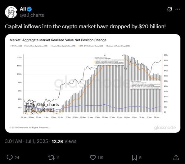 Dane na ten temat rozpowszechnił Ali Martinez. Popularny ekspert rynku kryptowalut przedstawił wykres, z którego wynika, że pod koniec czerwca z rynku walut cyfrowych wyparowało aż 20 mld dolarów. Martinez zaczerpnął dane z renomowanej platformy analityczne „Glassnode”.