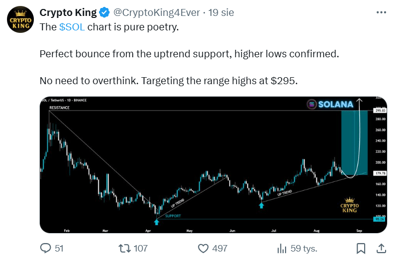 Co na to eksperci? Jonathan Carter widzi potencjał nawet do 268 dolarów, a Crypto King mówi wprost: jeśli trend się utrzyma, SOL ma szansę wrócić w okolice ATH na poziomie 295 dolarów. Do tego dochodzą zadowalające dane on-chain. Wysokie wolumeny, rosnące opłaty sieciowe, coraz większa dominacja Solany w DeFi. To wszystko pokazuje, że inwestorzy mają apetyt na dalsze wzrosty.