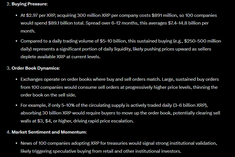 Grok wskazał, że zakup będzie wiązał się z łączną kwotą 30 miliardów XRP. To stanowi połowę całkowitej podaży XRP w obiegu. Chatbot zasugerował, że firmy te prawdopodobnie będą nabywać XRP stopniowo w ciągu sześciu do dwunastu miesięcy, zamiast dokonywać zakupu od razu. Głównie po to, aby zapobiec destabilizacji rynku.