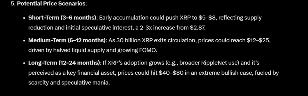 Na podstawie tego modelu Grok przewidział, że XRP wzrośnie do poziomu od 5 do 8 dolarów w ciągu najbliższych sześciu miesięcy. Oznacza to wzrost 2, a nawet 3-krotny z 2,87 dolara.