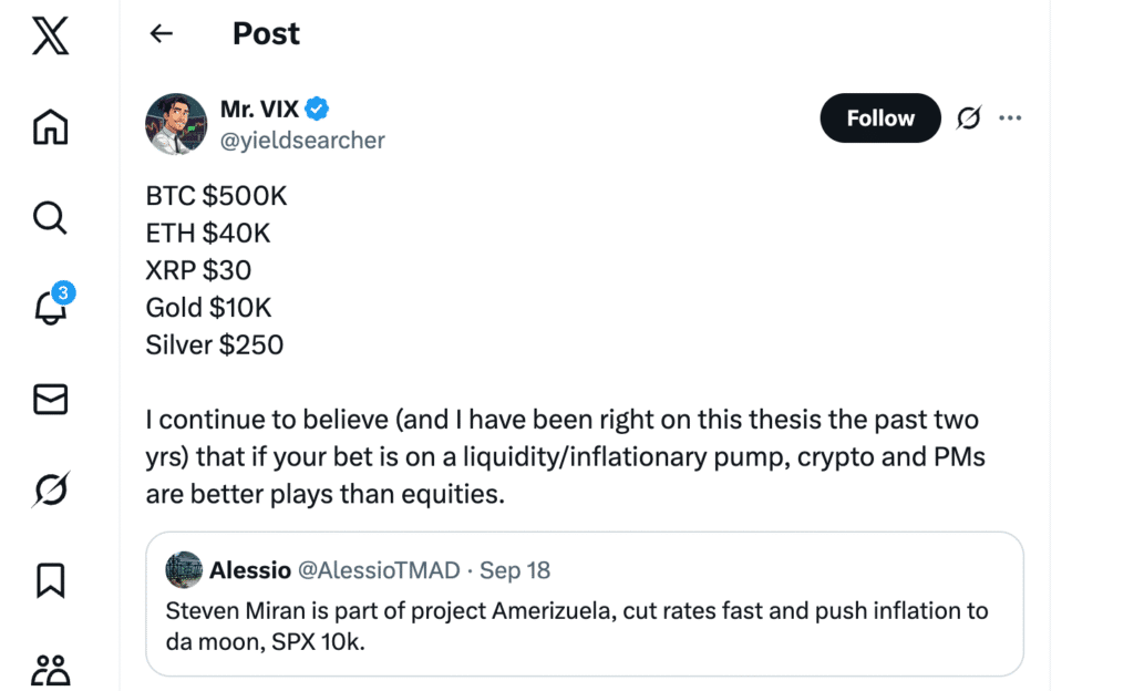 Dla XRP Pan VIX przewiduje 30 dolarów. To stanowiłoby dziesięciokrotny skok w stosunku do obecnego poziomu 2,80 USD. Uważa on, że wraz ze wzrostem płynności zarówno metali szlachetnych, jak i kryptowaluty będą przewyższyć akcje. Głównie ze względu na ich atrakcyjność jako żywopłotu.
