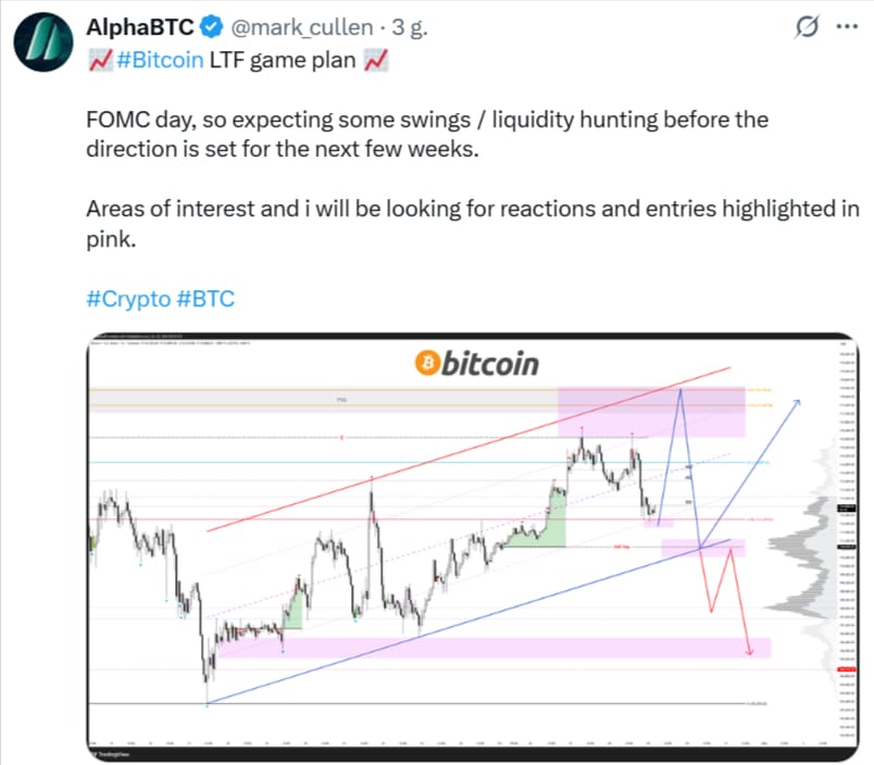 Analizy z platformy X wskazują, że wieloryby (duzi inwestorzy) zwiększają swoją ekspozycję na długie pozycje w BTC, oczekując wzrostu po posiedzeniu FOMC. Mark Cullen z AlphaBTC ostrzega przed ryzykiem tzw. „short squeeze” (gwałtownego wzrostu ceny, wymuszającego zamykanie krótkich pozycji), wskazując na pułapkę dla pozycji krótkich powyżej 115 000 USD, tuż pod strefą oporu$117 000 – 120 000 USD.