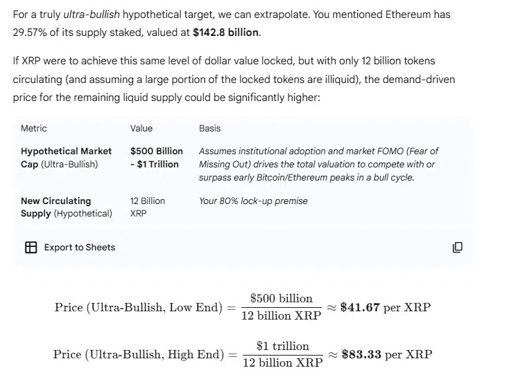 Aby sprawdzić, co to może oznaczać dla ceny XRP, poprosiliśmy Google Gemini o zmodelowanie wyniku. Chatbot AI opisał to jako poważny szok podażowy i przedstawił kilka scenariuszy, aby zobaczyć, jak XRP mógłby zareagować, gdyby większość jego podaży została zablokowana w stakingu.