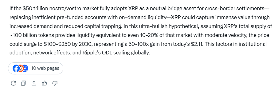 Aby zbadać potencjalny wpływ takiego scenariusza na cenę, zapytaliśmy Groka z xAI, jak zareagowałby XRP, gdyby banki polegały na nim, a nie na konkurencyjnych stablecoinach. I to w świecie, w którym salda nostro i vostro zbliżają się do 50 bilionów dolarów.