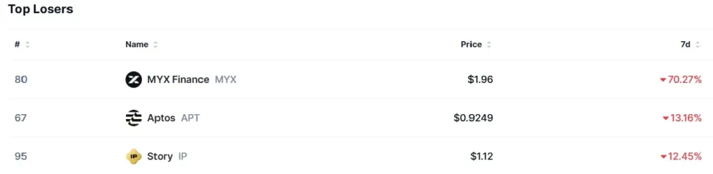 Trzecie miejsce na niechlubnym podium zajął Story (IP), który w ciągu ostatnich siedmiu dni stracił na wartości 12,45%. Jedną z głównych przyczyn spadku jest opóźnienie w odblokowaniu tokenów, co rynek odebrał jak negatywny sygnał. Odblokowanie miało pojawić się w tym miesiącu, ale ostatecznie zespół IP przesunął je na sierpień.