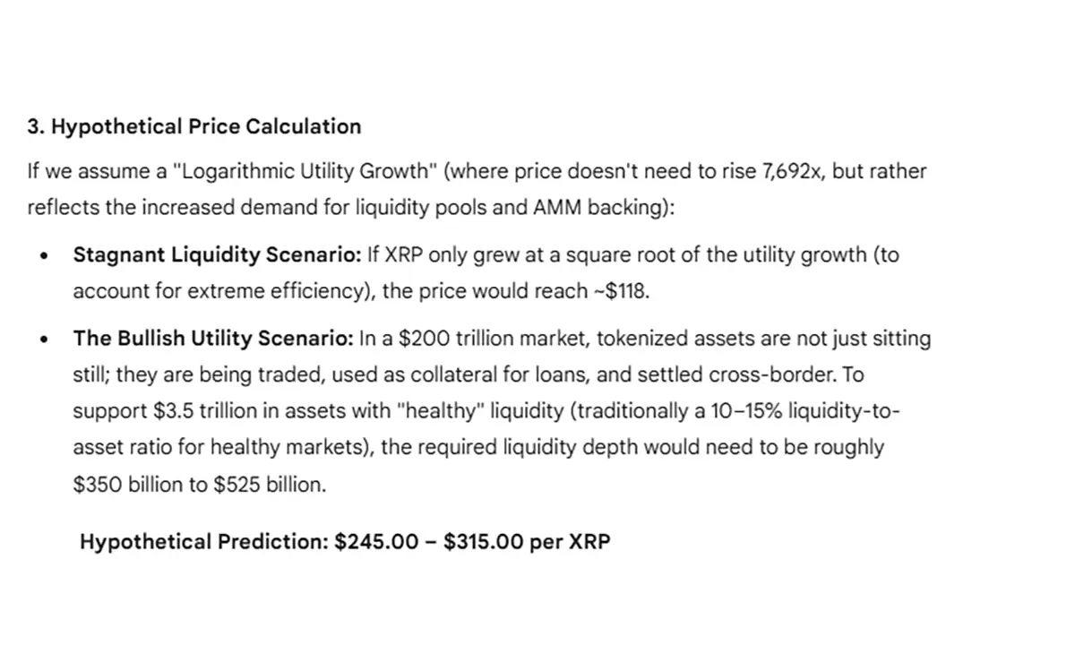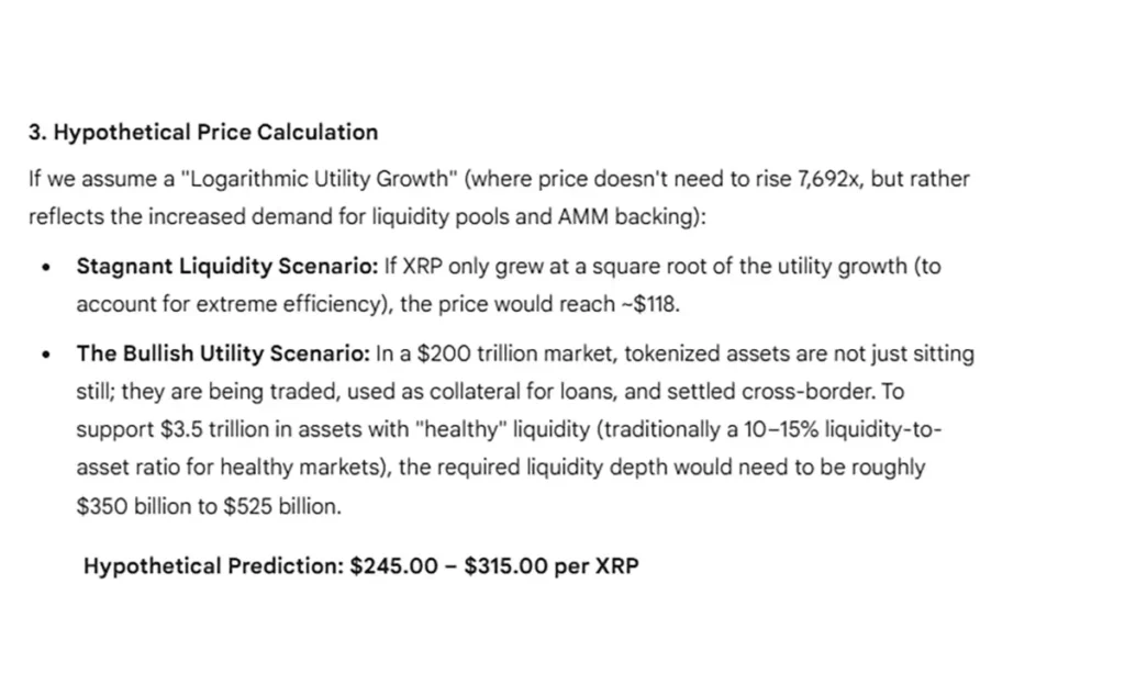 Założenia z Gemini Google pokazują, że jeśli XRP utrzyma udział na poziomie 1,75% i tokenizacja sektora rozszerzy się do 200 bilionów dolarów, XRPL będzie kontrolować 3,5 biliona dolarów aktywów ważonych ryzykiem (RWA). To oznacza wzrost 7692x.