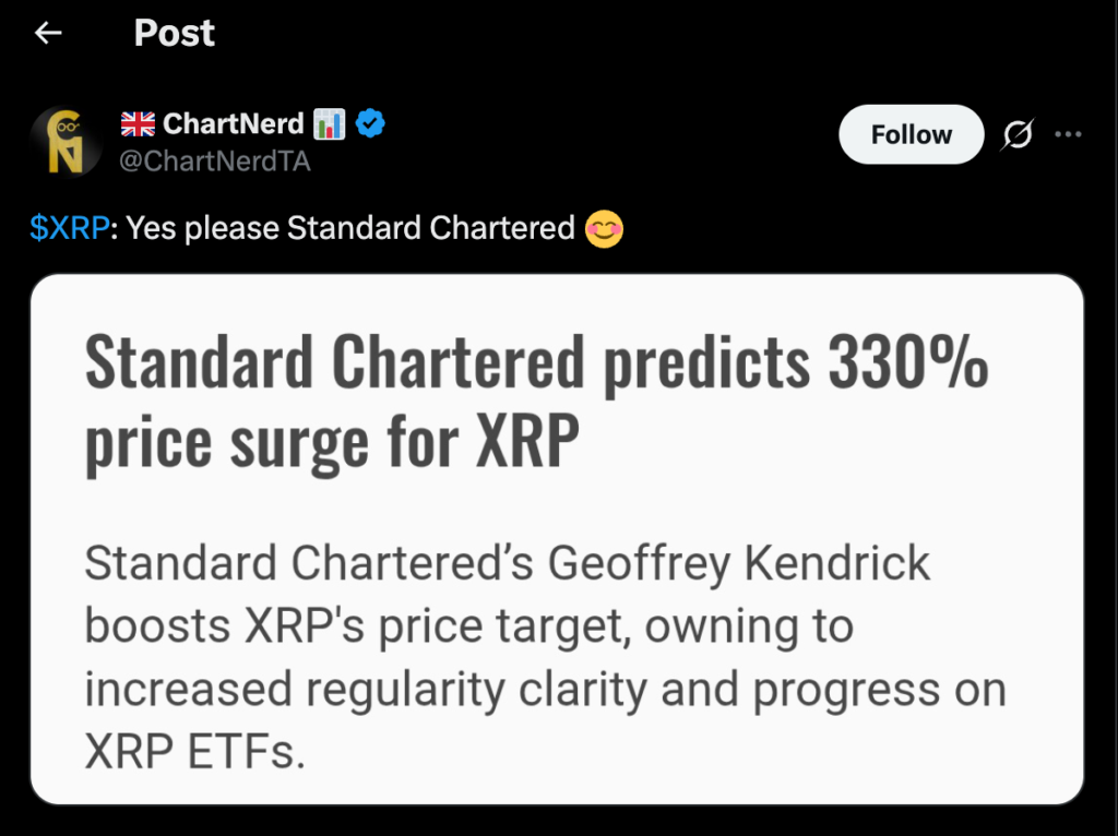 Standard Chartered opublikował jedną z najbardziej optymistycznych prognoz dotyczących XRP spośród największych światowych banków. Sugeruje, że największe zyski XRP mogą dopiero nadejść.