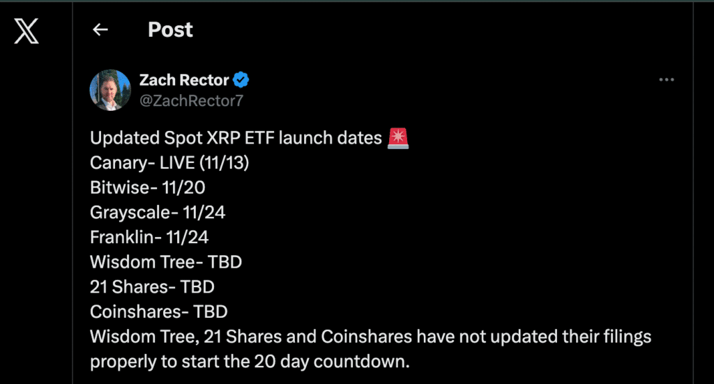 Analityk społeczności XRP Zack Rector przedstawił harmonogram, który wskazuje kiedy spodziewane jest uruchomienie pozostałych spotowych ETF-ów XRP. Jego analiza rozwiewa wątpliwości dotyczące dat, wymogów zgłoszenia oraz tego, którzy emitenci prawidłowo uruchomili 20-dniową regułę aktywacji.