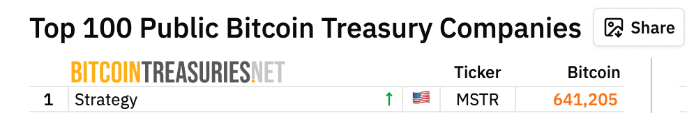 Na liście 100 największych spółek publicznych posiadających Bitcoina, według danych z Bitcoin Treasuries, firma Strategy (do lutego 2025 MicroStrategy) znajduje się obecnie na pierwszym miejscu.