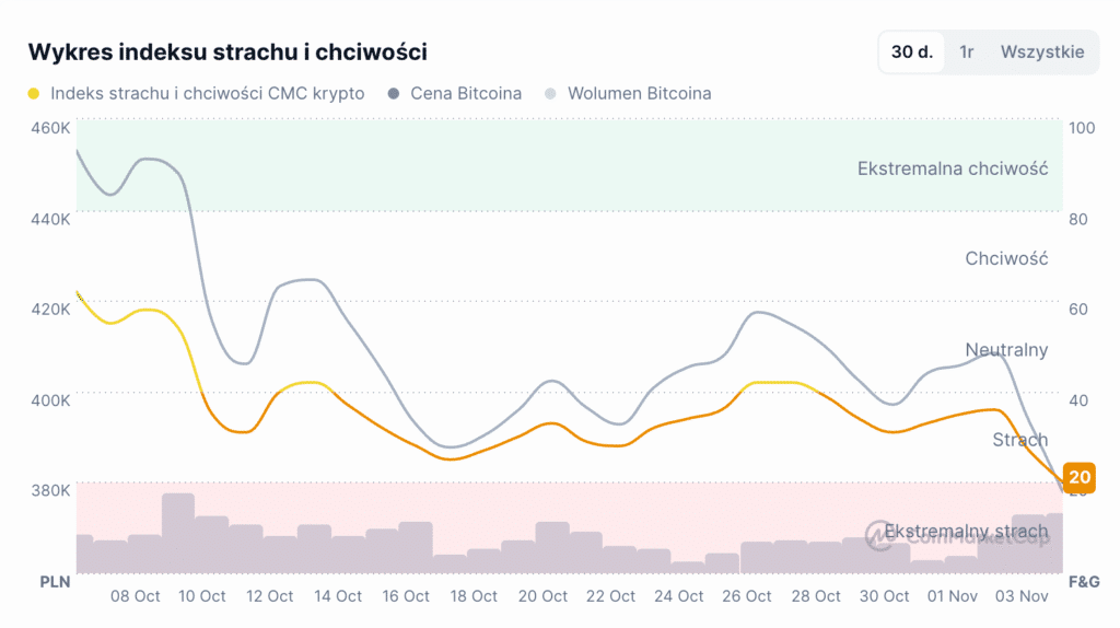 Rynek kryptowalut określa dziś ekstremalny strach. Indeks strachu i chciwości CoinMarket Cap spadł z 27 do 20, gdzie 100 oznacza ekstremalną chciwość, a 0 ekstremalny strach.