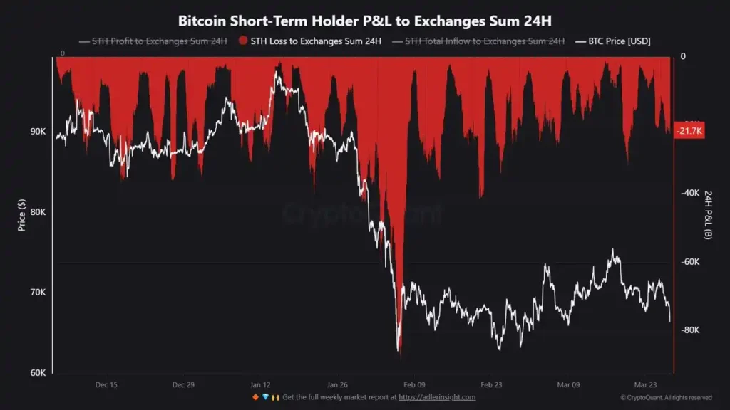 Dane on-chain pokazują, że w ciągu zaledwie 24 godzin inwestorzy krótkoterminowi przerzucili na giełdy około 21 700 BTC. To nie są przypadkowe ruchy. To ludzie, którzy chcą uciec ze swoich pozycji, choćby ze stratą. Wskaźnik Short-Term Holder P&L jasno pokazuje, że większość tych transferów odbywała się „na czerwono”. Czyli sprzedawali, mimo że tracili pieniądze. To jeden z najbardziej czytelnych sygnałów rynku: kapitulacja, złożenie broni, wycofanie się.