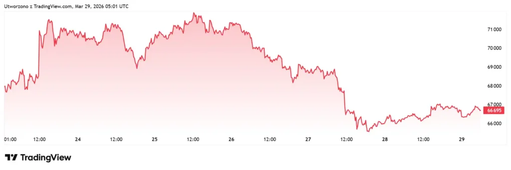 I tu zaczyna się robić naprawdę ciekawie. Jeszcze na początku marca Bitcoin wyglądał jak maszyna. Dobił do 76 000 dolarów i szykował się na pierwsze wyraźnie wzrostowe zamknięcie miesiąca od pół roku. Ten scenariusz właśnie się sypie. Kurs co prawda trzyma okolice 66 tys. dolarów, ale coraz więcej sygnałów wskazuje, że grunt zaczyna się osuwać.