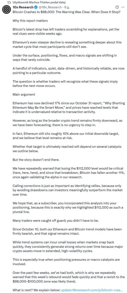 Eksperci rynkowi, jak Julian Pineda, analityk CFA, wskazują, że korekta ta jest głównie napędzana przez utrzymującą się presję sprzedaży wynikającą z odpływu kapitału z rynku BTC. Utrata atrakcyjności Bitcoina może być spowodowana rotacją kapitału w kierunku tradycyjnych aktywów, takich jak akcje technologiczne czy złoto, szczególnie pod koniec roku, kiedy profesjonalni inwestorzy dokonują rebalansowania portfeli, co zauważa Markus Thielen, dyrektor generalny 10X Research. Niektórzy analitycy, jak ci z giełdy Bitfinex, uspokajają jednak, sugerując, że odpływy z ETF-ów to „przejściowa słabość, a nie ryzyko strukturalne”, interpretując ten ruch jako stopniowe realizowanie zysków przez dużych posiadaczy, a nie paniczną wyprzedaż.