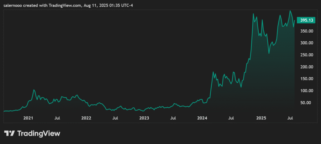 Wszystko zmieniło się po włączeniu Bitcoina w strategię firmy. W ciągu roku od pierwszego zakupu kurs Strategy wzrósł ponad czterokrotnie, z kilkunastu do ponad 70 dolarów. W kolejnych latach, wraz z rosnącym kursem BTC, pobił nawet rekord sprzed 24 lat. Dziś akcje warte są ponad 395 dolarów, czyli o 2600% więcej niż w 2020 roku.