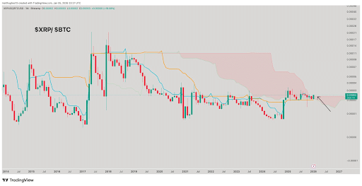 Chociaż ogólna słabość w czwartym kwartale 2025 r. przerwała ten postęp, od tego czasu para porusza sięd do dolnej krawędzi chmury w pobliżu 0,000025, ponieważ XRP odnotował wzrost o 24% w 2026 roku. Hughes zauważa, że chmura jest cieńsza niż kiedykolwiek od lat, a jego zdaniem konfiguracja ta przypomina układ poprzedzający wybicie w 2017 roku.