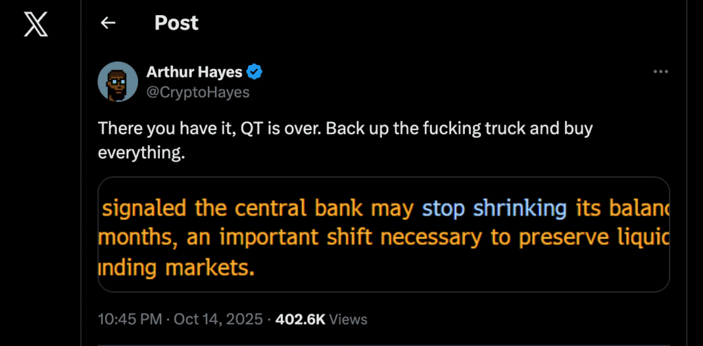 Mimo to Edwards i inni, tacy jak Współzałożyciel BitMEX Arthur Hayes, utrzymują optymistyczne nastawienie do sytuacji makroekonomicznej. Hayes namawiał uczestników rynku„kup wszystko” po sugestii prezesa Rezerwy Federalnej Jerome’a Powella, że zacieśnianie ilościowe dobiegło końca. Zmiana polityki historycznie sprzyjająca rynkom kryptowalut.