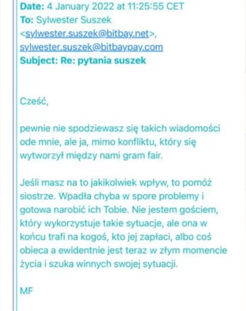 Jednym z dowodów na to miał być email, który na miesiąc przed swoim zaginięciem Sylwester otrzymał od Michała Fuji. Przypomnijmy, Michał Fuja był autorem bardzo krytycznych wobec Suszka reportaży (czy wręcz w niego godzących), wyemitowanych w TVN24. Jako taki – jak zaznaczył Kral – Fuja miał być ostatnią osobą, którą można by podejrzewać o sympatię wobec Suszka. Ostrzegł go jednak przed działaniami Nicole.