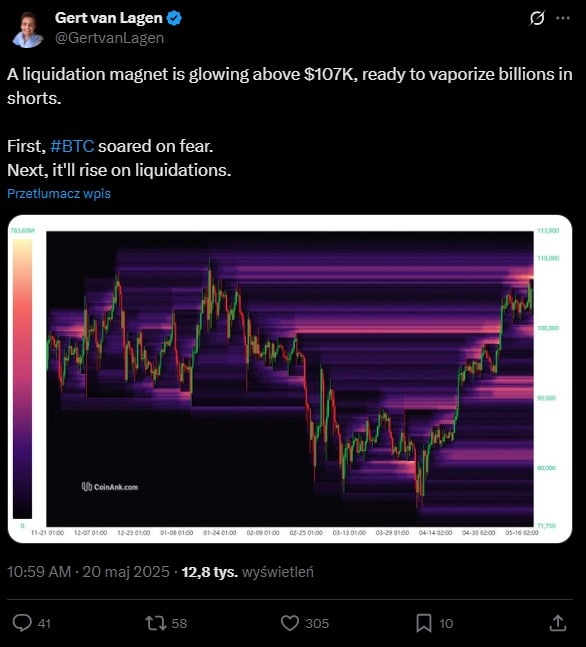 Bitcoin jest bliski potwierdzenia formacji złotego krzyża na wykresie dziennym, co w przeszłości zapowiadało wzrosty rzędu 45–60%. Taki ruch może zbiegać się z osiągnięciem nowych szczytów w maju. Zamknięcie miesiąca w okolicach 110 000 USD oznaczałoby wzrost o 15–17%, co byłoby najlepszym majowym wynikiem od 2019 roku, znacznie przewyższającym średnią miesięczną stopę zwrotu wynoszącą 8%. Co więcej – Analityk Gert van Lagen podkreśla, że powyżej 107 000 USD znajduje się magnes likwidacji, który może zmiażdżyć krótkie pozycje, napędzając dalsze wzrosty.