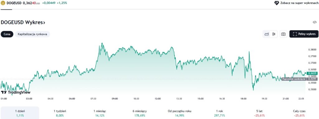 W chwili pisania tekstu moneta kosztuje 0,36 dolara i w ciągu ostatnich 24 godzin zyskał na wartości 1,11%. Z kolei przez ostatni tydzień i miesiąc DOGE wzrósł odpowiednio o 8% i 14,12%. Jeśli spojrzymy na obecne wyniki, to wzrost do 15 dolarów, o którym pisze Martinez, wydaje się czymś mało prawdopodobnym. Z drugiej strony rynek widział nie takie historie. Wystarczy spojrzeć na ostatni hit, czyli TRUMP, który w kilka godzin dobił do 70 dolarów i stał się jedną z największych kryptowalut.