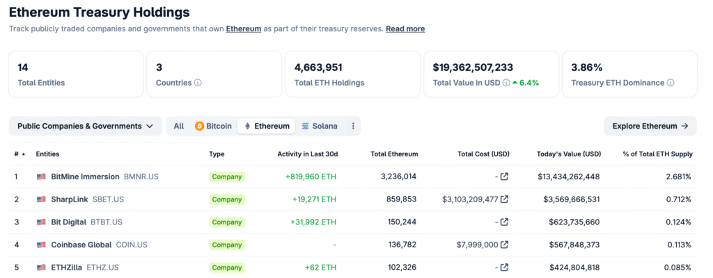 Według danych CoinGecko, SharpLink jest obecnie drugim największym korporacyjnym posiadaczem ETH na świecie, dysponując 859 853 ETH o łącznej wartości ok. 3,57 mld USD, co stanowi 0,71% całkowitej podaży Etheru. Planowana alokacja 200 mln USD odpowiada ok. 5,6% całego skarbca firmy.