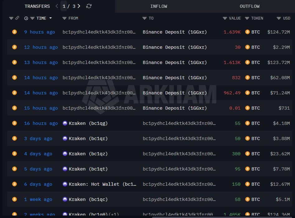Z danych udostępnionych przez platformę do analityki danych z łańcucha bloków Arkham Intelligence wynika, że inwestor akumulował bitcoiny głównie za pośrednictwem giełdy Kraken, płacąc średnio po blisko 99 tys. dolarów za monetę. Decyzja o sprzedaży zapadła w momencie, gdy kurs BTC zanurkował poniżej 77 tys. dolarów, co zbiegło się z rosnącą nerwowością na amerykańskich rynkach akcji. Większość środków trafiła na depozyty giełdy Binance, a pojedyncze transfery sięgały nawet 962 sztuk BTC, czyli po około 71 mln dolarów. W historii portfela widoczne są również świeże wpłaty z Krakena, w tym 300 BTC zaledwie kilka dni przed całkowitym.
