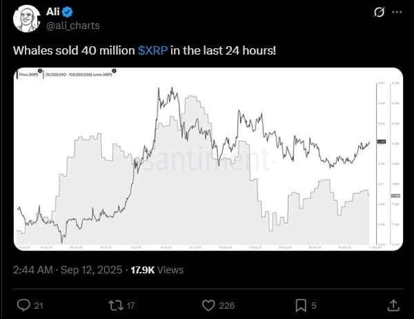 Jak poinformował Ali Martinez w jednym z ostatnich wpisów na X, w ciągu ostatniej doby wieloryby sprzedały łącznie 40 mln sztuk XRP. Dane, które przedstawił Martinez, pochodzą z renomowanej platformy analitycznej „Santiment”.