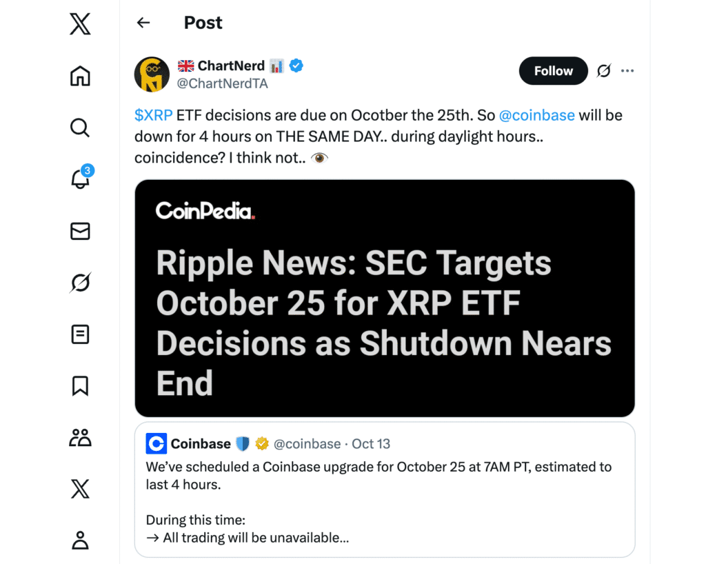 Analityk XRP ChartNerd zwrócił uwagę na „ciekawy zbieg okoliczności”. Zaplanowana konserwacja Coinbase na 25 października zwróciłą jego uwagę. To jest ten sam termin ogłoszenie przez SEC decyzji w sprawie kilku zgłoszeń ETF-ów spot na XRP.