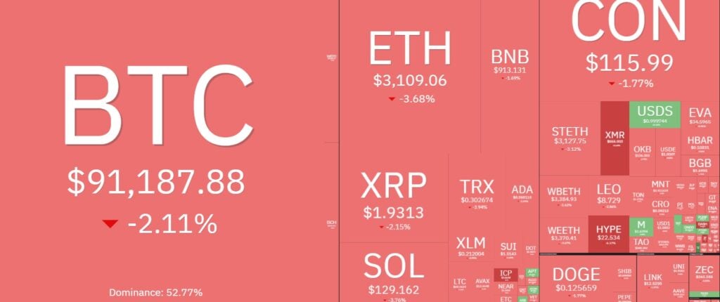 Jeszcze kilka dni wcześniej BTC wydawał się gotowy na atak na barierę 100 000 USD, po tym jak w środę osiągnął 98 000 USD, najwyższy poziom od wielu tygodni. Jednak końcówka tygodnia przyniosła zmianę nastrojów. Podczas weekendu Bitcoin utrzymywał się wokół 95 000 USD, lecz wraz z otwarciem rynków azjatyckich i kontraktów futures w poniedziałek, kurs gwałtownie się osunął – najpierw do 92 000 USD, a następnie do poniżej 91 000 USD. Aktualnie BTC walczy o utrzymanie tego poziomu, a jego kapitalizacja rynkowa spadła poniżej 1,82 bln USD. Dominacja Bitcoina nad altcoinami wzrosła do 57,5%, co odzwierciedla fakt, że reszta rynku traci jeszcze szybciej.