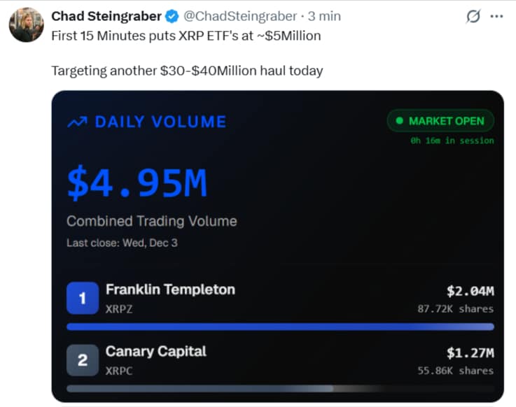 Inwestorzy wykazali ogromne zainteresowanie nowo notowanymi funduszami ETF opartymi na XRP, o czym świadczy ich dynamiczny start. W ciągu pierwszych 15 minut sesji handlowej łączny wolumen obrotu osiągnął imponujący poziom 4,95 miliona USD. Liderem tego wczesnego handlu okazał się fundusz Franklin Templeton, który wygenerował wolumen w wysokości 2,04 miliona USD. Tuż za nim uplasował się Canary Capitalz wynikiem 1,27 miliona USD w tym samym krótkim okresie. Tak wysoki wolumen na samym początku sesji wskazuje na dużą płynność i potwierdza silne oczekiwania rynku, by dzienny handel zamknął się w przedziale 30–40 milionów dolarów.