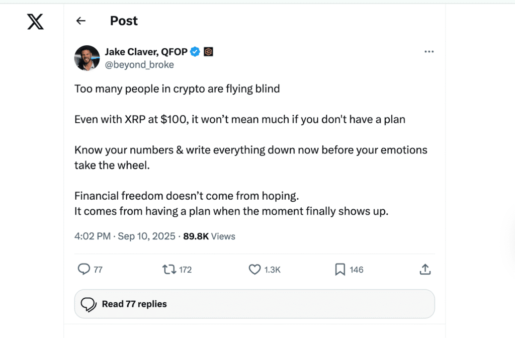 Jake Claver, dyrektor generalny Grupy Digital Ascension, wydał mocne ostrzeżenie dla społeczności XRP. Ostrzegł, że nawet jeśli XRP gwałtownie wzrośnie do 100 dolarów za żeton, nie będzie to miało większego znaczenia dla posiadaczy bez jasnej strategii finansowej.