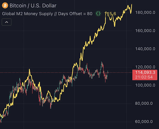 Analityk Vivek prognozował możliwą cenę docelową bitcoina na poziomie 180 000 USD, wiążąc ją z rosnącymi poziomami globalnej płynności. Dane historyczne pokazują, że każdy gwałtowny wzrost globalnego M2. Po wzroście podaży nastąpiło przyspieszenie ceny Bitcoina, często z opóźnieniem. Jeśli ten trend się utrzyma, rosnąca płynność może przesunąć kapitał z tradycyjnych aktywów do zdecentralizowanych magazynów wartości, takich jak BTC.