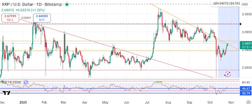 Zaufanie do XRP wzrosło w październiku, gdy wieloryby nabyły tokeny o wartości ponad 560 milionów dolarów. Przy cenie XRPw okolicach 2,67 USD, analitycy obserwują poziomy oporu na poziomie 3,22 USD i 3,60 USD, które ograniczyły wzrost cen od lipca. Analityk kryptowalut Stephanie Starr powiedziała: „Ten poziom był kluczową barierą od miesięcy. Zamknięcie powyżej 3,22 USD może potwierdzić kolejne wybicie”.