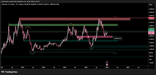 Analityk kryptowalut Laurisa udostępniła wykres pokazujący, że Ethereum odzyskuje kluczowy poziom oporu, który ograniczał wzrosty w latach 2024 i 2025. „Ethereum wygląda świetnie” – powiedziała Laurisa na X, nazywając to wybicie długoterminową zmianą rynku. Dane historyczne potwierdzają tę konfigurację, ponieważ wcześniejsze cotygodniowe wybicia powyżej podobnych poziomów prowadziły do dalszego ruchu wzrostowego. Zwłaszcza gdy utrzymywały się podczas retestów.