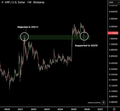 W piątek cena XRP odzyskała znaczący poziom wsparcia w okolicach 1,96 USD. Czyli poziom, który w 2021 roku stanowił silny opór. To przejście z oporu do wsparcia jest zachęcającym sygnałem dla byków, ponieważ takie „odwrócenia oporu” zazwyczaj sygnalizują trend wzrostowy, gdy towarzyszy im duży wolumen.