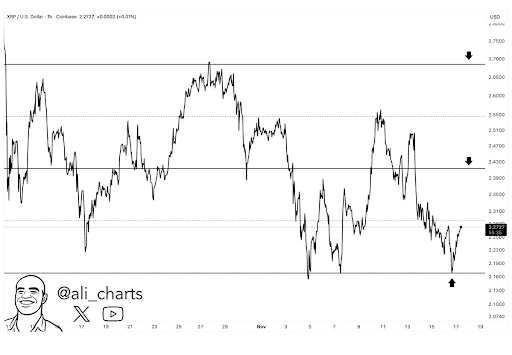Poza przewidywanym napływem kapitału instytucjonalnego, wykresy techniczne XRP wskazują na oznaki wzrostowego momentum. Cena XRP konsoliduje się obecnie powyżej kluczowego poziomu wsparcia 2,15 USD – strefy krytycznej, która zapewniła już stabilność we wcześniejszych okresach zmienności. Obecnie cena XRP wynosi około 2,21 USD. Analitycy zauważają, że utrzymanie się powyżej 2,15 USD może wywołać kontynuację wzrostów w kierunku przedziału 2,40–2,70 USD.