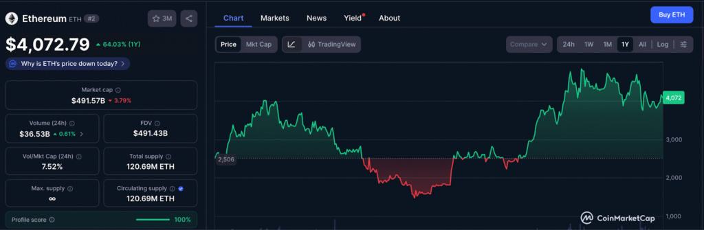 Ethereum w 2025 roku nadal przewyższa oczekiwania. Nawet po niedawnym śledzeniu spadku wartości Bitcoina, cena ETH oscyluje w okolicach 4000 USD. Nadal jest na poziomie 41% wzrostu od początku roku, przewyższając 30% wzrost Bitcoina.