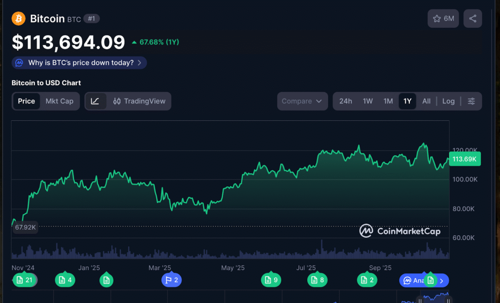 Ostatni spadek o ok. 6% od szczytu 116 tys. dolarów jest odczytywany jako zdrowy reset po nowych szczytach, a nie wyczerpania trendu. Zwłaszcza że napływy spot ETF i zakupy obligacji skarbowych przedsiębiorstw nadal absorbują podaż na tych poziomach.
