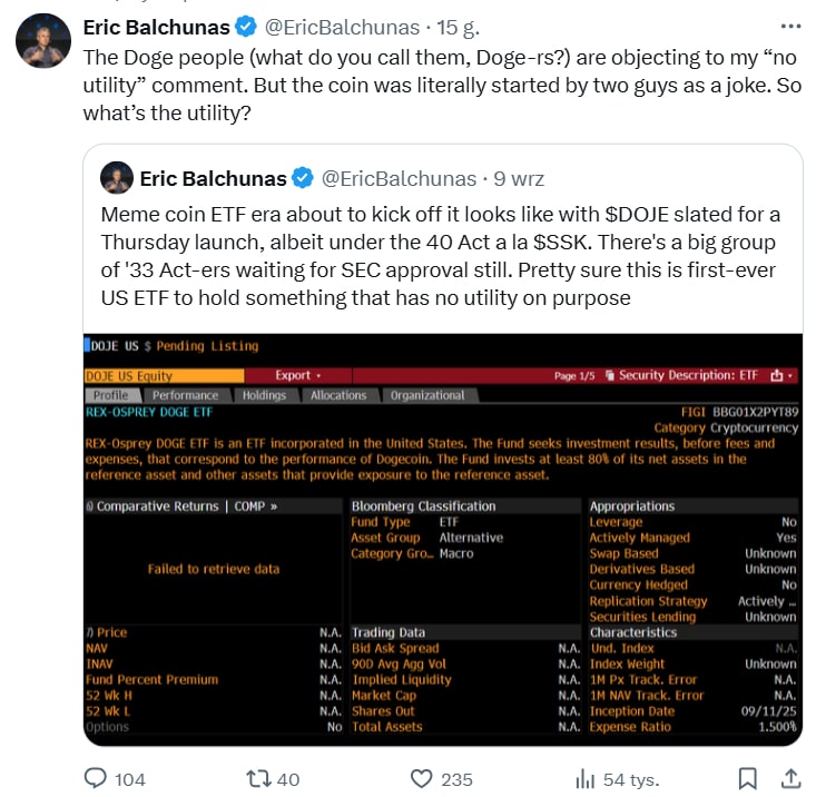 Tymczasem coraz więcej osób zwraca uwagę, że oferowanie funduszu ETF na jeden token jest absurdalne i mija się z celem. Brian Huang, dyrektor generalny Glider, zauważa, że opłaty pobierane przez fundusz można łatwo uniknąć, kupując Dogecoina bezpośrednio na giełdzie, takiej jak chociażby Coinbase. Dodatkowo, pojawia się pytanie, dlaczego aktywo stworzone jako żart, z nieograniczoną podażą i bez zdefiniowanej użyteczności, wyprzedziło w drodze do instytucjonalizacji projekty o bardziej solidnych podstawach.