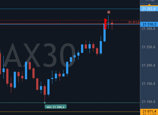 Trader nie podzielił się jednak z obserwującymi publicznie targetami, jakie obrał sobie dla poniższego zagrania. Analizując załączony wykres można natomiast się spodziewać, że jego moment wyjścia ze stratnej pozycji (stop loss) będzie miał miejsce w okolicach 21 352 pkt.