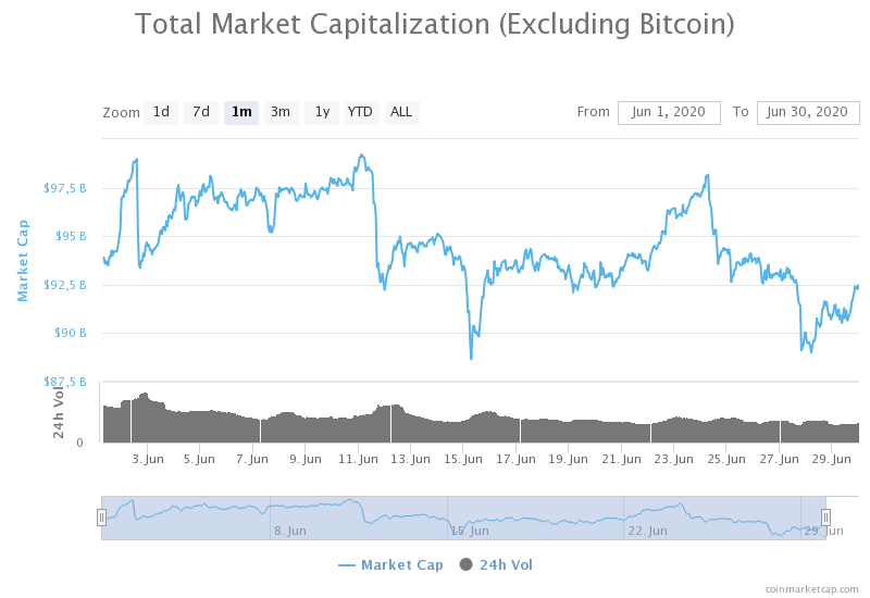 W czerwcu kapitalizacja rynkowa kryptowalut stanowiła w najwyższym punkcie rząd 285 000 000 000 USD a w najniższym – 258 000 000 000 USD. Rekordowy poziom z 10 lipca 2019 r. o wartości 357 000 000 000 USD pozostaje zatem niezagrożony. Ostatecznie rynek zakończył miesiąc czerwiec ustalając kapitalizację rynku kryptowalut na poziomie 260 054 765 557 USD.