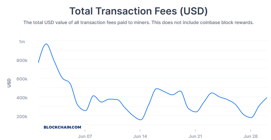 W czerwcu dzienna ilość transakcji BTC wahała się w przedziale 253 000 a 355 000. Wartość wskaźnika potwierdzonych transakcji zakończyła miesiąc na wysokości ok. 299 733: