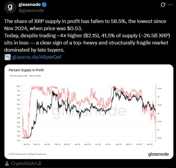 To w jak dużym kryzysie znaleźli się posiadacze XRP dobitnie pokazuje wskaźnik rentowności. Najnowsze ustalenia Glassnode ujawniły, że na dzień 18 listopada ponad 41% podaży XRP w obiegu (około 26,5 miliarda tokenów) przynosi obecnie stratę. Oznacza to, że grono posiadaczy, którzy nabyli Ripple po cenach wyższych, niż obecnie, rośnie. Rentowność XRP spadła do najniższego poziomu od listopada 2024 roku. Z danych platformy wynika, że obecnie wielu posiadaczy nabyło alcoin w momencie, gdy kosztował powyżej trzech dolarów.