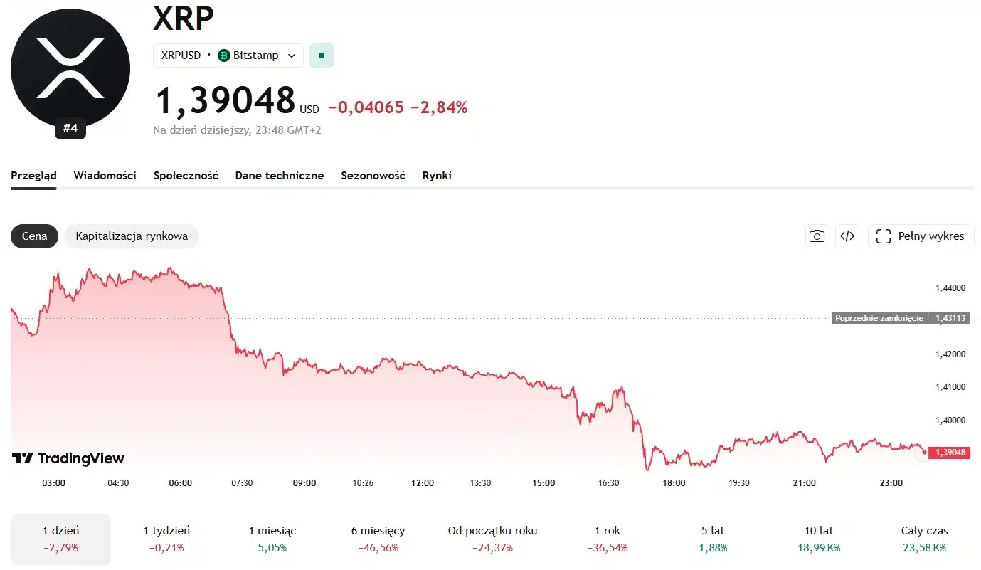W chwili pisania tekstu altcoin kosztuje 1,39 USD, a w ciągu ostatnich 24 godzin spadł o 2,79%. W ujęciu tygodniowym token nie wykonał żadnego istotnego ruchu (-0,25%). Z kolei w zestawieniu miesięcznym token zyskał na wartości 5,02%. Od początku roku (Year To Date) XRP spadł o 24,41%. Trudno zatem ocenić jak zachowa się kurs po odblokowaniu. Trend długoterminowy jest spadkowy, ale ostatni miesiąc jednak przyniósł odbicie.