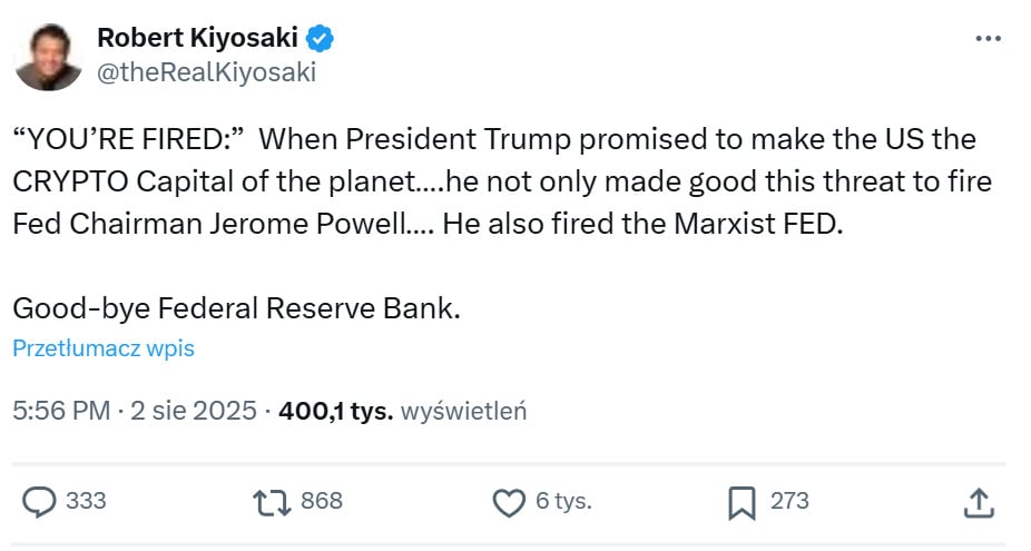 Z perspektywy zwolenników teorii spiskowych i fanów wolnego rynku – jak Robert Kiyosaki – to, co się dzieje, to nie dekonstrukcja systemu, ale… jego uzdrowienie. Dla autora „Bogatego ojca, biednego ojca”, Rezerwa Federalna od lat była „marxist Fed” – reliktem systemu opartego na dodruku, redystrybucji i nierówności. Trump, w tym ujęciu, nie tylko „zwalnia Powella” – on symbolicznie zwalnia cały system. Czy to ryzykowna gra? Oczywiście. Ale w narracji Kiyosakiego – nie ma innej drogi do „nowego kapitalizmu”.