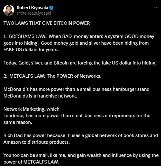 Według Kiyosakiego, inflacja i nadmierne drukowanie pieniędzy dosłownie pożerają wartość walut fiducjarnych. W przeciwieństwie do dolara, Bitcoin – podobnie jak złoto czy srebro – należy do kategorii, w jego mniemaniu, „dobrych pieniędzy”. Tu w grę wchodzi prawo Greshama, które mówi, że „złe pieniądze wypierają dobre”. W praktyce oznacza to, że gdy dolar słabnie, ludzie coraz chętniej zwracają się ku alternatywom. Między innymi takim jak Bitcoin.