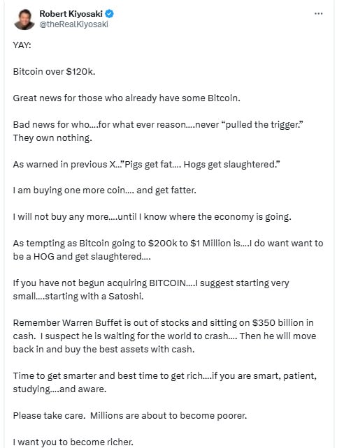 Bitcoin przebił próg 120 tysięcy dolarów, co dla wielu entuzjastów kryptowalut to moment triumfu. Dla tych, którzy już mają BTC, to raczej powód do radości. Jednak Kiyosaki zauważa gorzką prawdę. Wszyscy, którzy zwlekali z zakupem Bitcoina, dziś są poza rynkiem … I zdecydowanie powinni tego żałować.