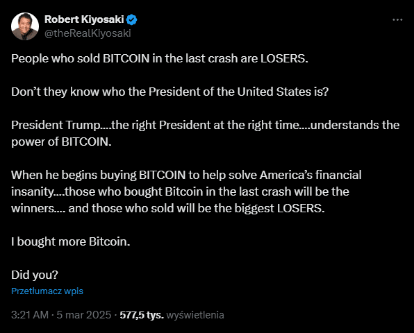 Zdaniem Kiyosakiego, sprzedaż Bitcoina po spadkach stanowiła poważny błąd i należało wykorzystać tę okazję, aby (w miarę możliwości) dokupić więcej tokenów. Autor wskazuje na rządy prezydenta Donalda Trumpa jako czynnik, który w jego opinii będzie sprzyjał dalszemu wzrostowi wartości Bitcoina. Sam przyznał, że dokupił BTC w trakcie niedawnego spadku kursu, wierząc, że jest to ruch przemyślany i perspektywiczny.